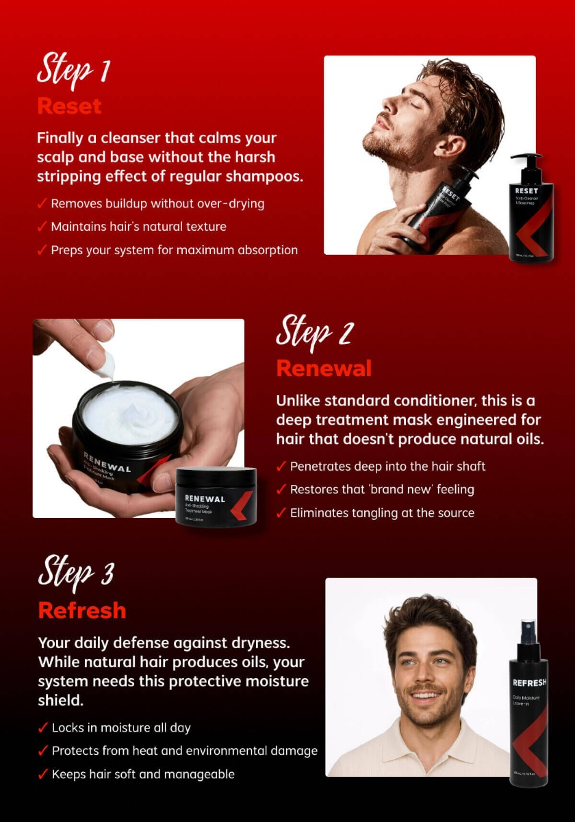 For healthy, resilient hair, this collection combines Reset, Renewal, and Refresh—offering complete care from preparation to daily maintenance.